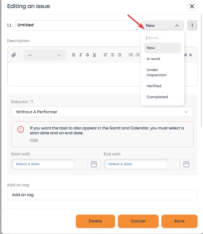 Important! In task editing window, you can change task status by selecting another column from the drop-down list.